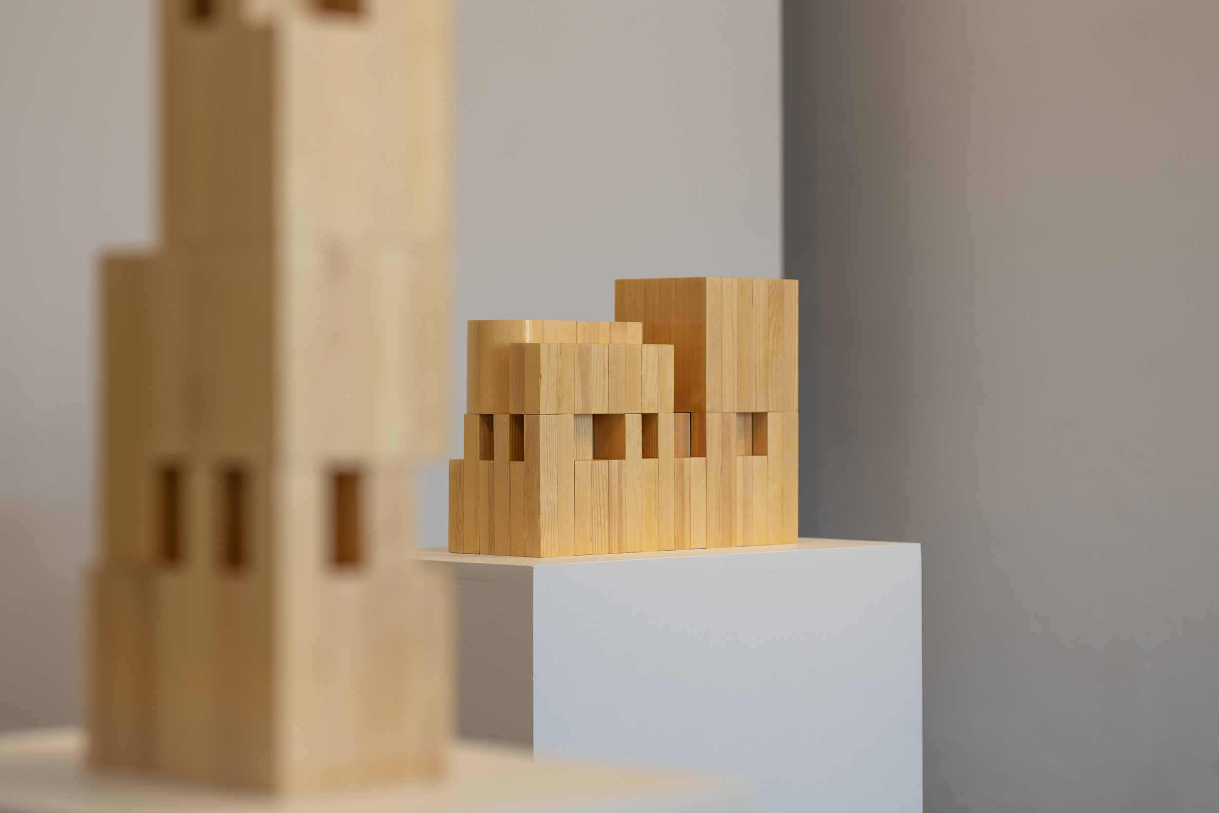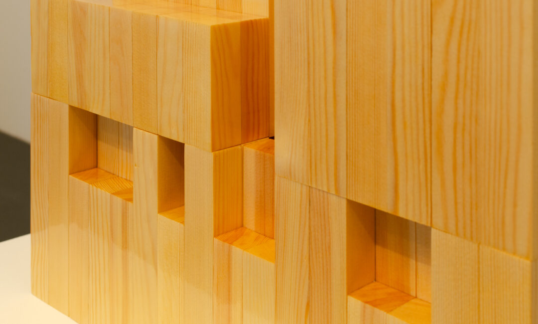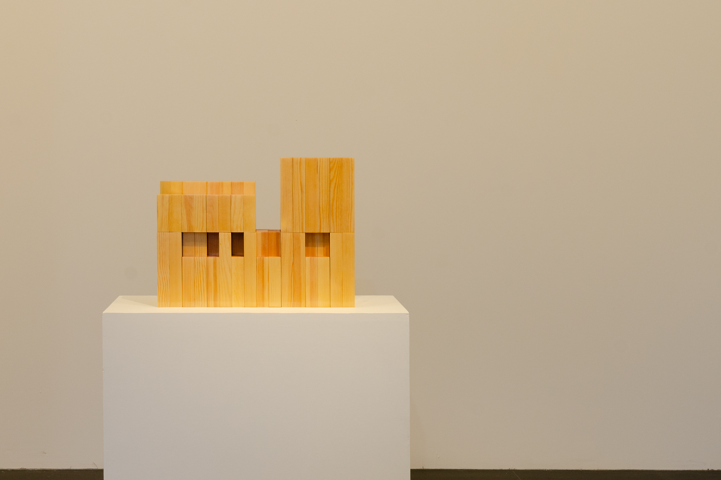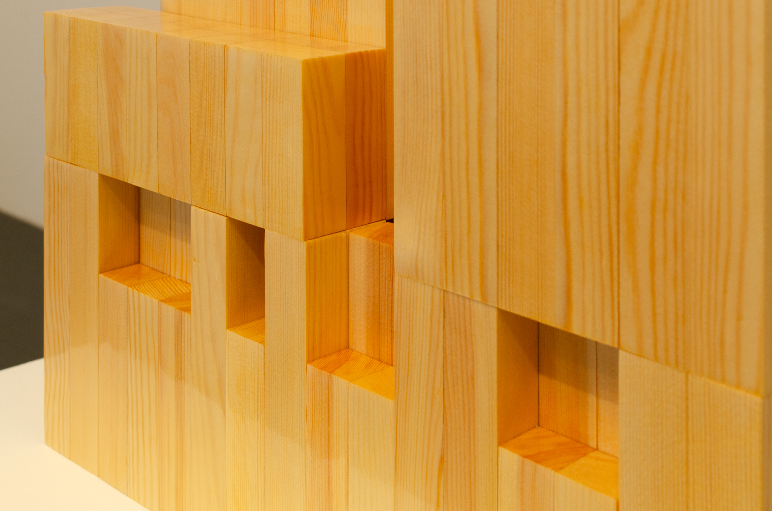 The sculptures are composed of parts that echo one another and follow certain serial proportions. The rhythm and the buildup of intensity through repetition and variation are integral to the work. The main material used in the sculptures is pine, whose grain pattern generates its own rhythm in relation to the structure. The glossy lacquer finish brings out and intensifies the tonal depth of the material. The look of the pine is based on long lateral grain patterns and ties formed by the cut wood’s growth rings.