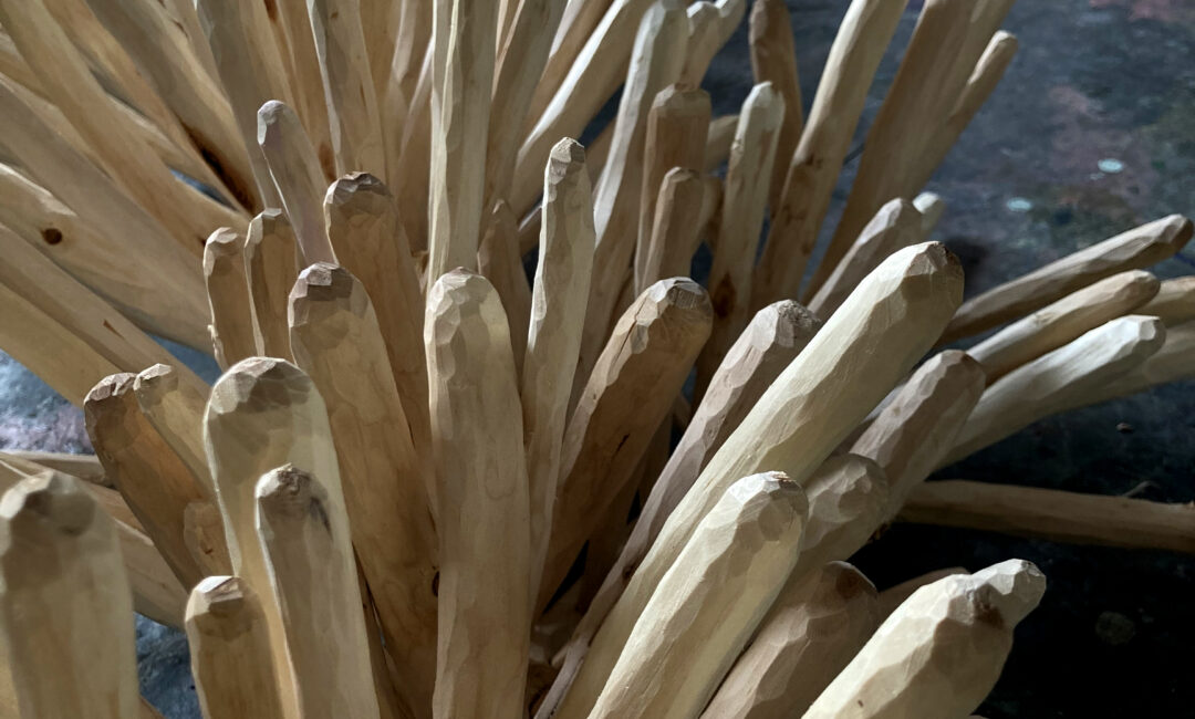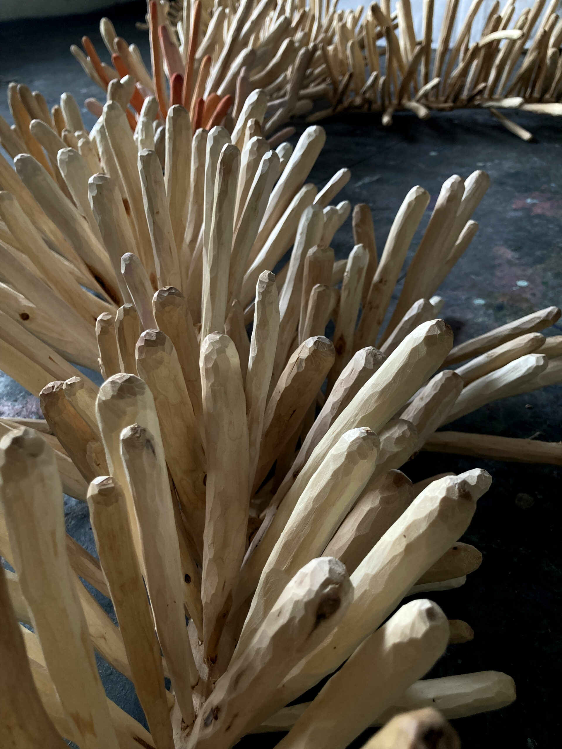 Mari Oikarinen (b. 1981) is a visual artist who lives and works in Rovaniemi. She works with structural wooden sculptures as well as textile materials, using slow, craft-based methods. Long processes and the gradual growth and expansion of works over the years are characteristic of Oikarinen’s practice.