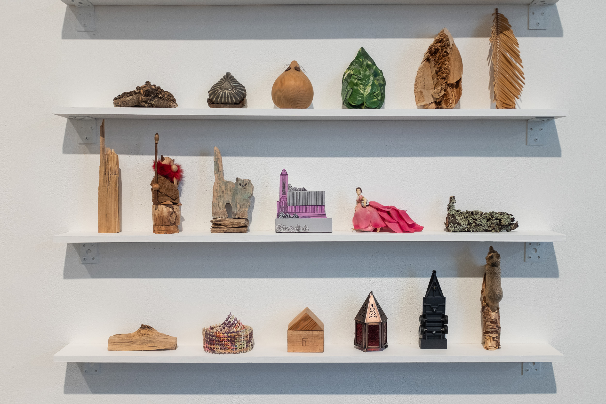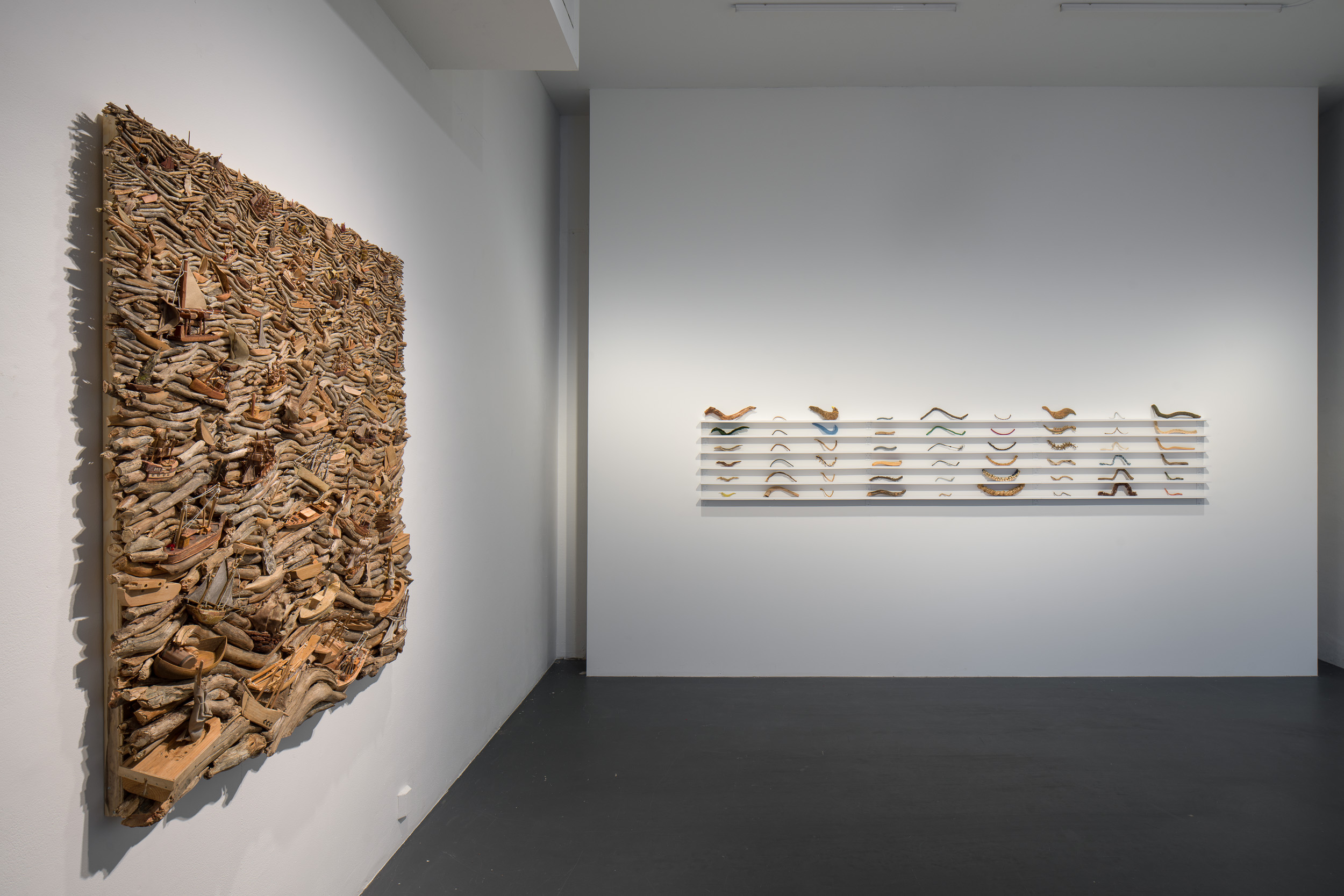The works in the exhibition are made of different parts which share a nearly similar form. In the works, ready-made objects encounter natural materials collected along forest paths. Elements from diverse origins intermingle, are juxtaposed, and reorganized according to visual criteria.